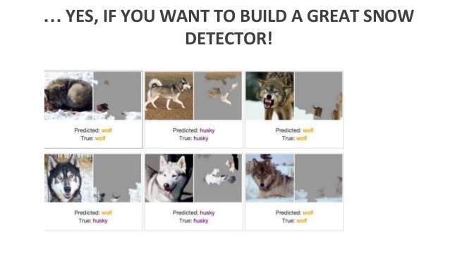 Even if we don’t expect a machine to ever be as smart as humans, we still need results interpretable to ensure fairness, transparency, and accountability. The fairness concerns with whether resources are shared “equally” between parties or whether a rule is applied consistently. Many researchers including myself argue that fairness is subjective and therefore needs to be measured at the user level. We spent a lot of time looking into human factors (sensual, perceptual, societal, etc.) and studying how the machine can take into account individual preferences and experience. However, I often feel what we do is an exercise of incorporating biases. The algorithm would allocate more resources to picky users and hungry user devices so that there is minimum QoE (quality of user experience) discrepancy across a group of users. You might disagree with my understanding of fairness but at least we are able to discuss what’s right and wrong based on my reasoning. With a high degree of complexity, an ML model can produce excellent outcomes with the wrong reason. The image below from Dr Kasia Kulma’s talk is a perfect showcase. The model which achieves high precision in classifying wolf and husky apparently recognise wolves by detecting snow in the picture. It certainly capitalised on the high probability of snow and wolf co-appearance in an image: a smart move to deliver results but not necessarily what we consider as intelligent. For fairness, the reasoning often outweighs the outcome.