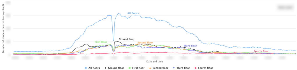 The source of our networking data is the Cisco controllers. The DNA centre offers secure APIs while the WLC has a well structured interface for data scraping. Either option worked for us so we have Python-based data sampling functions programmed for both interfaces. What we collect is a “snapshot” of all devices in our wireless networks and the details of the APs they are connected to. All device information such as MAC addresses can be hashed as long as we can differentiate one device from another (count unique devices) and associate a device across different samples. We think devices’ movements on campus as a continuous signal. The sampling process is essentially an ADC (analog to digital conversion) exercise similar to audio sampling. The Nyquist Theorem instructs us to take a minimum sampling frequency as least twice the highest frequency of the analog signal to faithfully capture the characteristics of the input. In practice, the signal frequency is determined by the density of wireless APs in an area and how fast people travel. In a seating area on our Learning Hub ground floor, I could easily pass a handful of APs during a minute long walk. Following the math and sampling from control centre every few seconds risks killing the data source (and unlikely but possibly entire campus network). As the first prototype, I compromised on a 1/min sampling rate. This may not affect our understanding of the movement between buildings that much (unless you run really fast between buildings) but we might need some sensible data interpolation for indoor movements (e.g., a device didn’t teleport from the third floor library to a fourth floor class room, it traveled via stairwell/lift).
