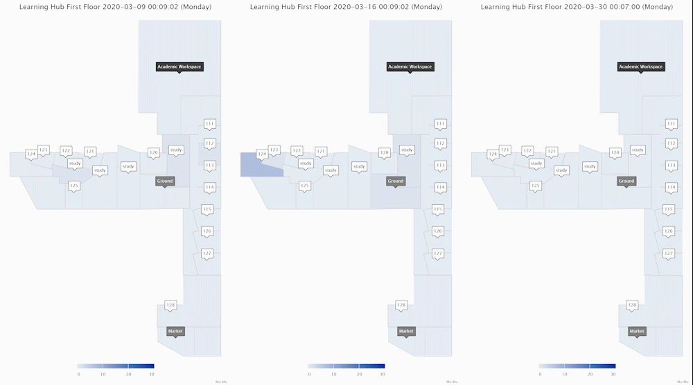These ones above show the area crowd density dynamics of one floor of an academic building. The one on the left shows how an academic workspace, a few classrooms and study areas were used during a normal week when few people in the UK felt the COVID-19 is relevant to them. The middle one shows the week when there were increasing reports of COVID-19 cases in the UK and the government was changing its tones and advising social distancing. Staff and students reduced their hours on campus. The one on the right shows a week during university closure (building still accessible for exceptional purposes).