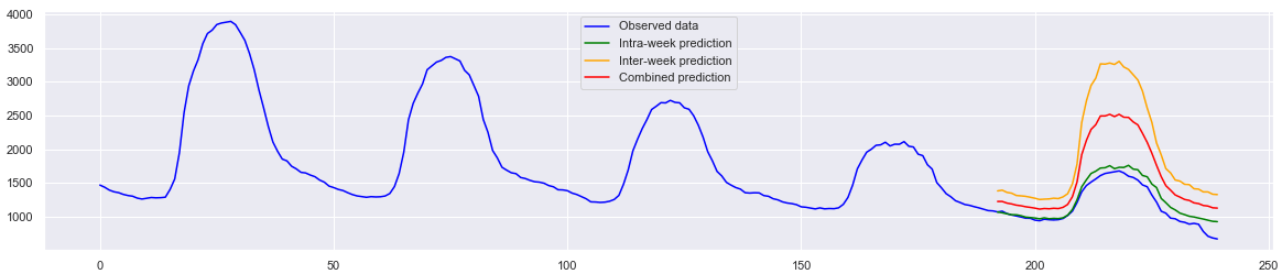 Figure above shows the predictions of campus occupant level on Friday 6th March. The blue curve plots the observed data on that week (Monday to Friday). The green curve depicts the “intra-week” predictions based on data observed during the same week, i.e., using Monday-Thursday’s data to guess Friday’s data. This method can respond to extraordinary situations in a particular week. If we chain all weekday data then in theory it’s possible to make prediction for any weekday of the week, practically ignoring the differences across weekdays. However, we know that people’s activities across weekdays are not entirely identical. Students have special activities on Wednesdays and everyone tries to finish early on Fridays. This explains why the intra-week predictions overestimate occupancy level for Friday afternoon. The orange curve gives the “inter-week” prediction based on previous four Fridays. This method captures normal activities on Fridays but is agnostic to week-specific changes (e.g., the week prior to exams). Balancing intra- and inter-week predictions using a simple element-wise Mean, the red curve shows the “combined” prediction. For this particular prediction exercise, the combined method does not show better MSE measurement compared with the inter-week version, partially due to the overestimates.
