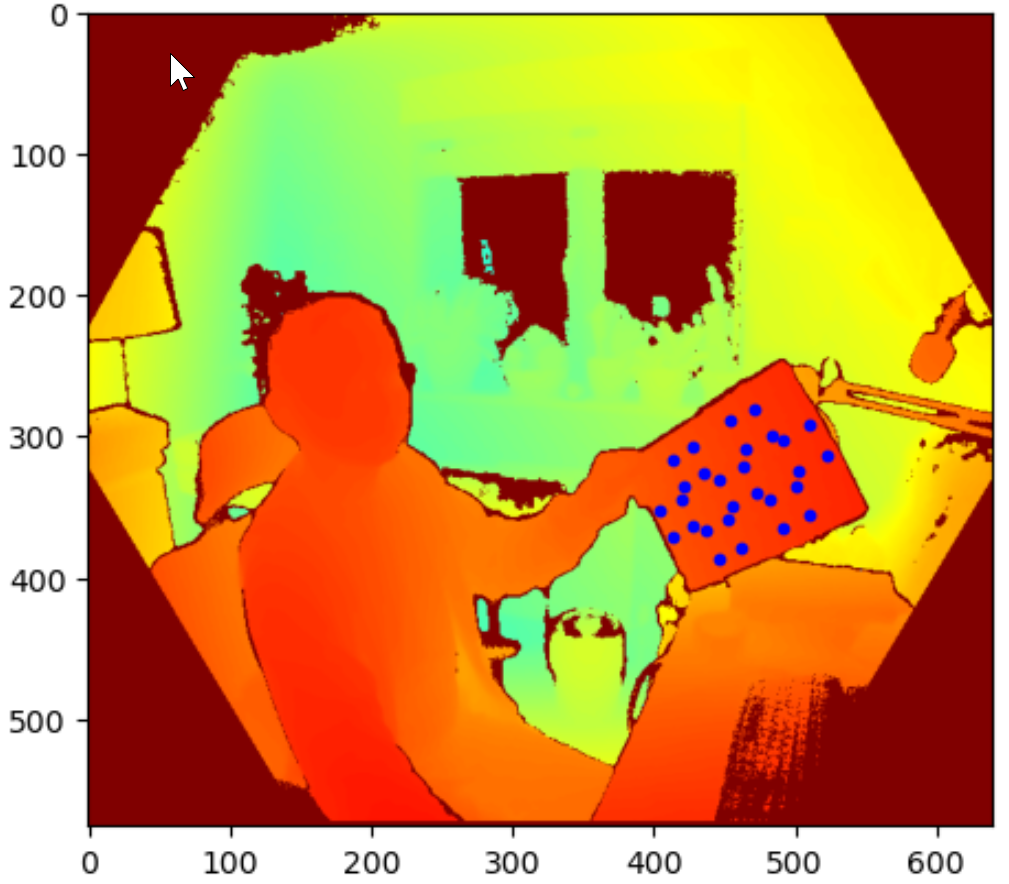 With 28 reference points from each camera, the next step is to repeat what was done on the 32 body joints and generate a new transformation matrix. However, additional step is needed. The marker detection was done using the colour camera because the depth camera could only see a flat surface and no markers. So all the marker coordinates are in the colour camera’s 2D coordinate system, i.e., all the red markers points in above image are flat with no depth. These points are then mapped to the depth camera’s 3D coordinate system using Kinect DK SDK’s transformation and calibration functions.