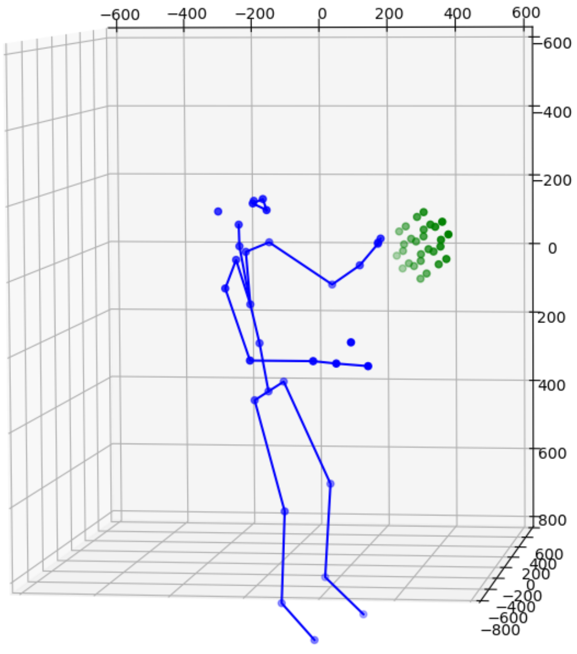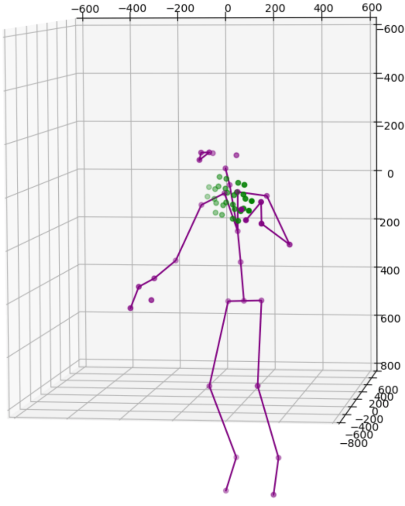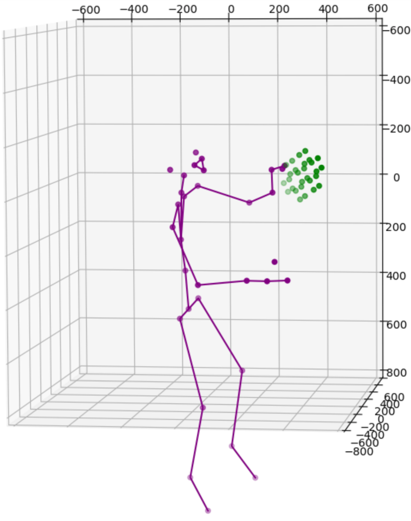 One solution is to simply add more cameras. Because each camera uses itself as the reference point to express the location of any object it sees, the same object will get different location readings from all cameras. For instance, the images above show data from 2 cameras of a single subject. Therefore we need to calibrate the data feeds from all cameras. This is normally done by transforming data from one coordinate system e.g., a secondary camera to a reference coordinate system e.g., the master camera. Ideally, the process will reshape the blue figure in the image above to match the shape of the purple figure exactly or vice versa. The transformation itself is straightforward using matrix multiplication but some work is needed to derive the transformation matrix between each camera pair. Luckily, OpenCV already includes a function estimateAffine3D() which computes an optimal affine transformation between two 3D point sets. So our main task is to get the associated 3D point sets from the 2 cameras. The easiest option to get the point sets is to reuse the 32 joint coordinates from cameras since they are tracking the same subject.