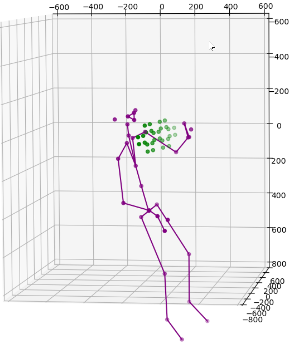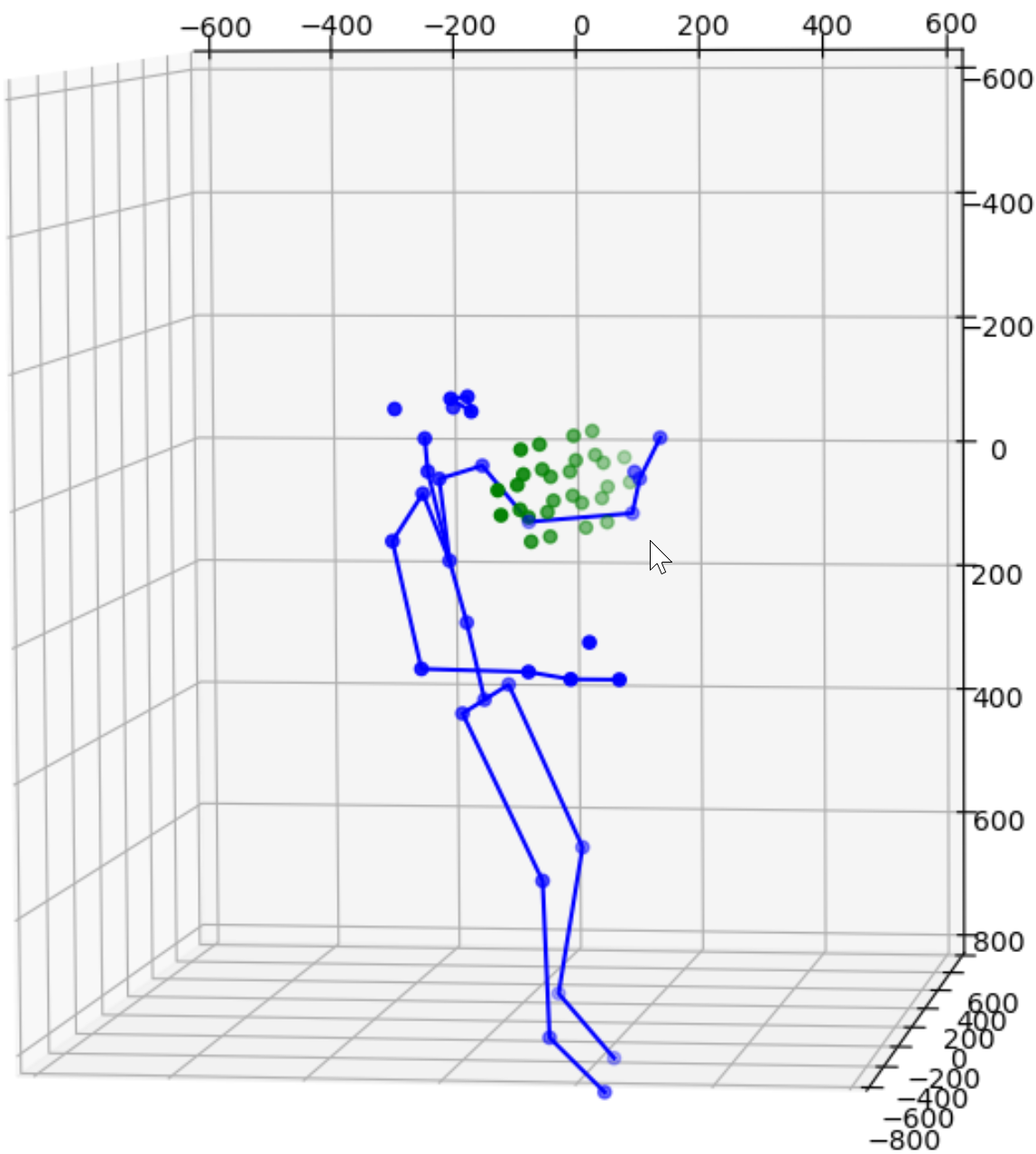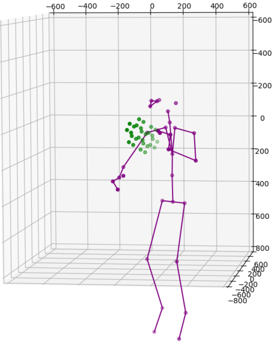 One solution is to simply add more cameras. Because each camera uses itself as the reference point to express the location of any object it sees, the same object will get different location readings from all cameras. For instance, the images above show data from 2 cameras of a single subject. Therefore we need to calibrate the data feeds from all cameras. This is normally done by transforming data from one coordinate system e.g., a secondary camera to a reference coordinate system e.g., the master camera. Ideally, the process will reshape the blue figure in the image above to match the shape of the purple figure exactly or vice versa. The transformation itself is straightforward using matrix multiplication but some work is needed to derive the transformation matrix between each camera pair. Luckily, OpenCV already includes a function estimateAffine3D() which computes an optimal affine transformation between two 3D point sets. So our main task is to get the associated 3D point sets from the 2 cameras. The easiest option to get the point sets is to reuse the 32 joint coordinates from cameras since they are tracking the same subject.