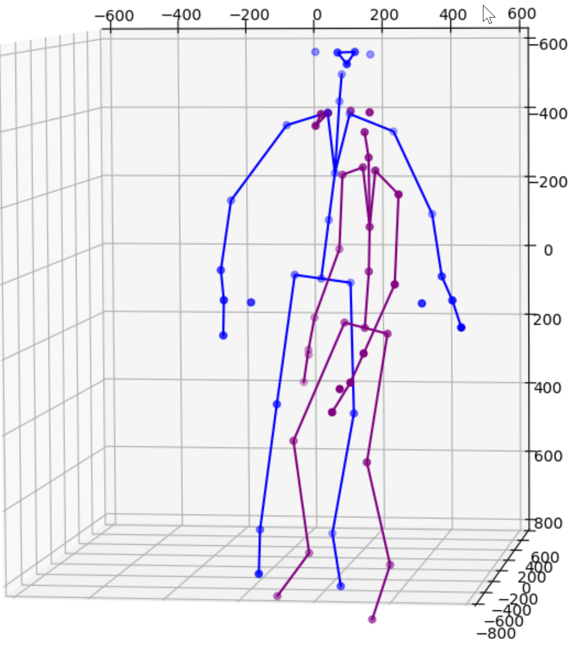 Feeding the joint coordinates to estimateAffine3D() will result in the above transformation matrix in homogeneous coordinates. I eliminated all low confidence joints to reduce the noise. In this case, the matrix is designed to transform readings from device 1 to device 2. The image below shows how the blue figure is mapped to the coordinate system of the purple figure. The result is nearly perfect from the chest above. The lower body is not great because they are not captured directly by our cameras.