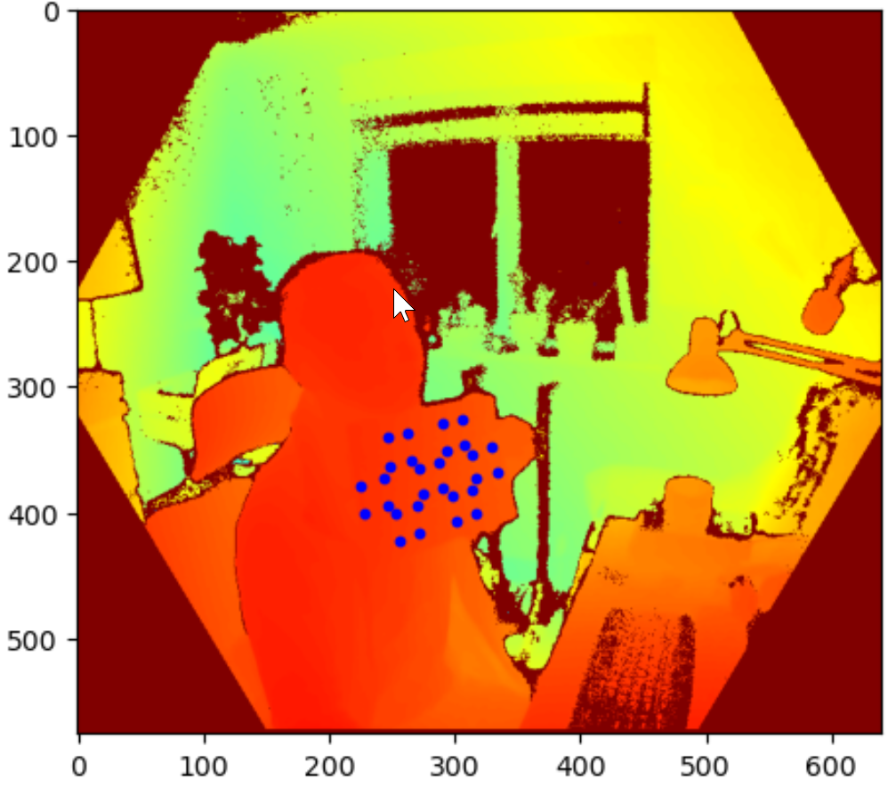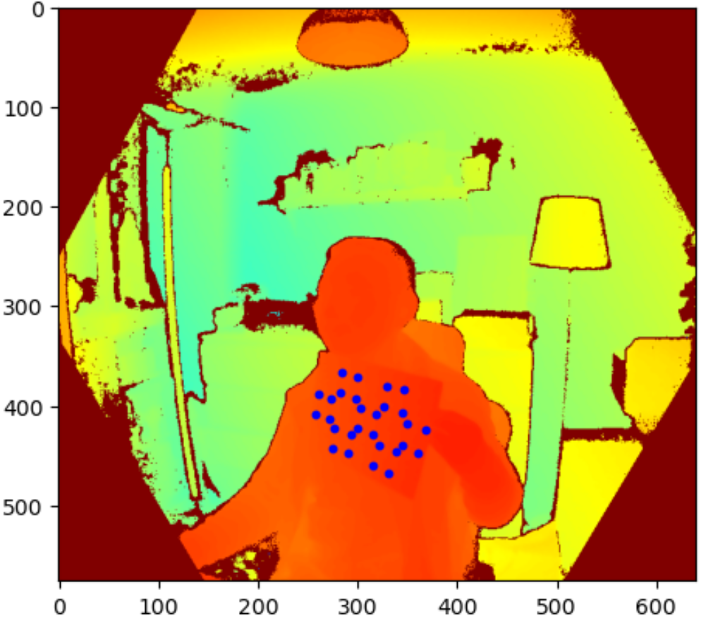 Firstly, all marker points are transformed from 2D colour space to 2D depth space as seem above (marker super-imposed on depth image). Knowing the locations of the markers on the depth image allowed me to find the depth information for all markers.