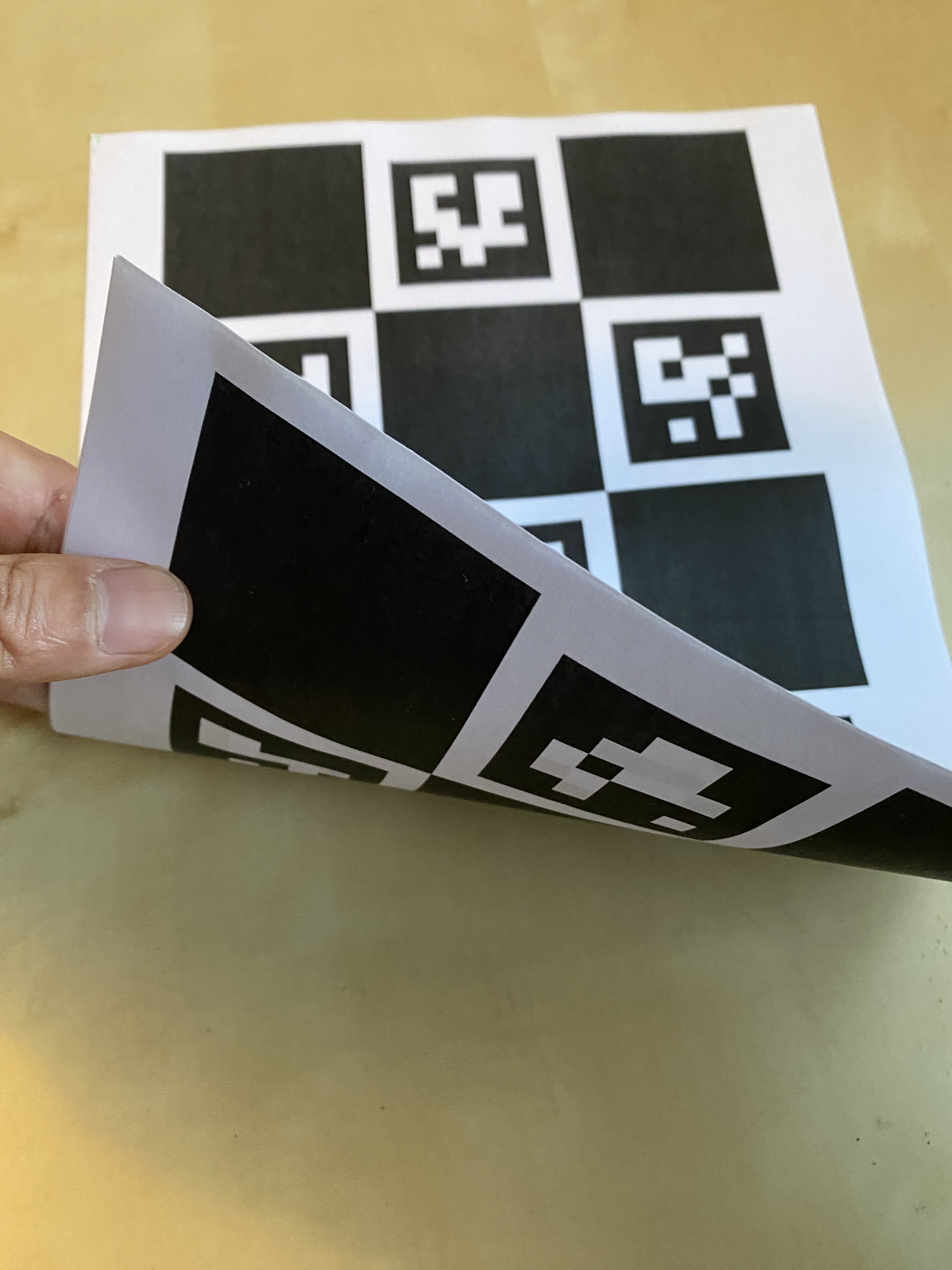 This 2-sided card has a standard ChArUco board on each side. The image above shows one side with marker ID 0 to 6 and the other side with marker ID 10 to 16. The corners of each marker on one side are aligned with a corresponding marker on the other side. So marker corners on one side are practically identical to marker corners detected by an different camera on the other side (with the error of the paper thickness that can be offset if necessary). A custom mapping function is developed to synchronise markers reported by cameras on each side of the paper. For instance, marker ID 0, 1, 2 are mapped to marker ID 12, 11, 15. The corner point order should also be changed so that all 28 points will be in the correct order on both sides. This approach requires some hard coding for each 2-sided card so I am hoping to automate this process in the future.