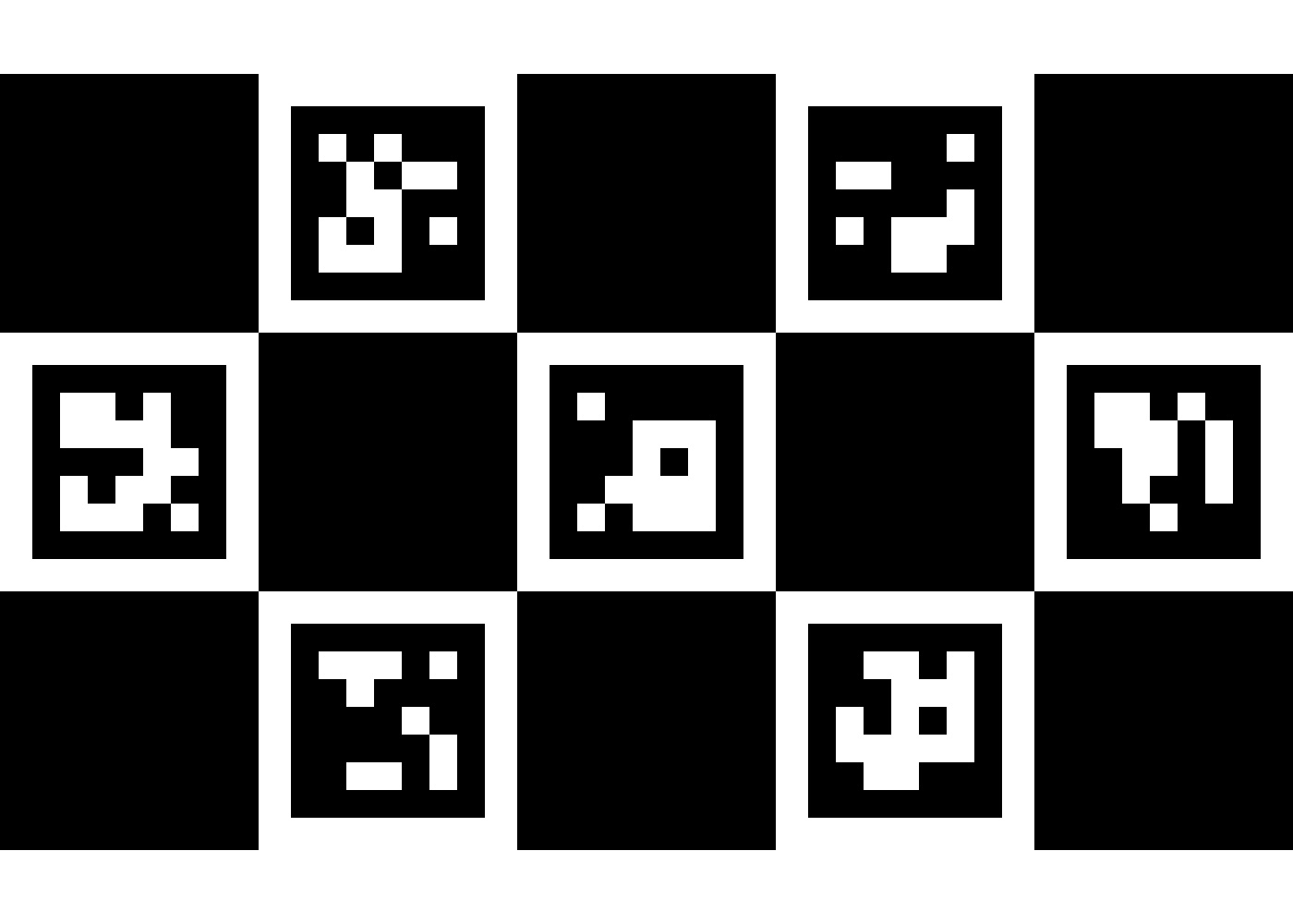 ArUco are binary square fiducial markers commonly used for camera pose estimation in computer vision and robotics. Using OpenCV’s aruco library, once can create a set of markers by defining marker size and dictionary size. the same library can be use to detect markers and their corners (x, y coordinates in a 2D image). The marker size determines the information fidelity, i.e., how many different markers is allowed. Each marker has its own ID for identification when multiple markers are present. The maximum dictionary size is therefore determined by the marker size but normally a much smaller dictionary size is chosen to increase the inter-marker differences. ChArUco is a combination of ArUco and chessboard to take advantage of ArUco’s fast detection and the more accurate corner detection permitted by the high contrast chessboard pattern. For my application scenario, ArUco’s corner detection seems accurate enough so ChArUco is only used to better match ChArUco boards on the front and back of a paper (more explanations below). The image below is a 3 by 5 ChArUco board with 7 ArUco makers (marker size 5 by 5 and dictionary size 250). This particular board has markers with the ID from 0 to 6.